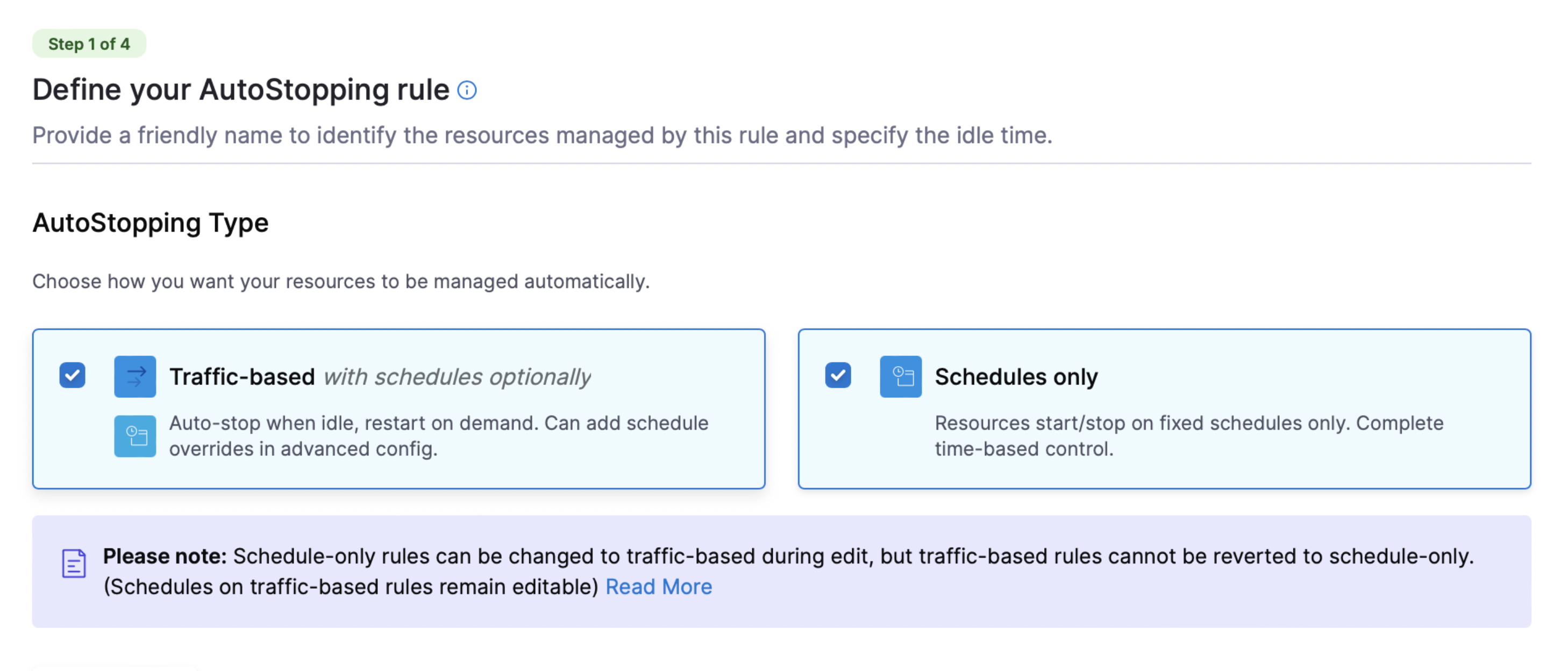 • Streamlined Autostopping Rule Creation: CCM has introduced a use case-based setup with intuitive Traffic-based and Schedule-based mode selection. The interface dynamically adjusts to display only relevant configuration fields, simplifying the setup process and improving user experience. [CCM-24600]