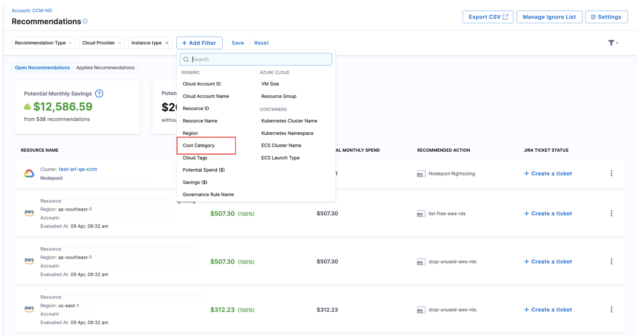 • New Filters in Cloud Integration: We have added new filters on Account Settings > Integration for Cloud Cost.