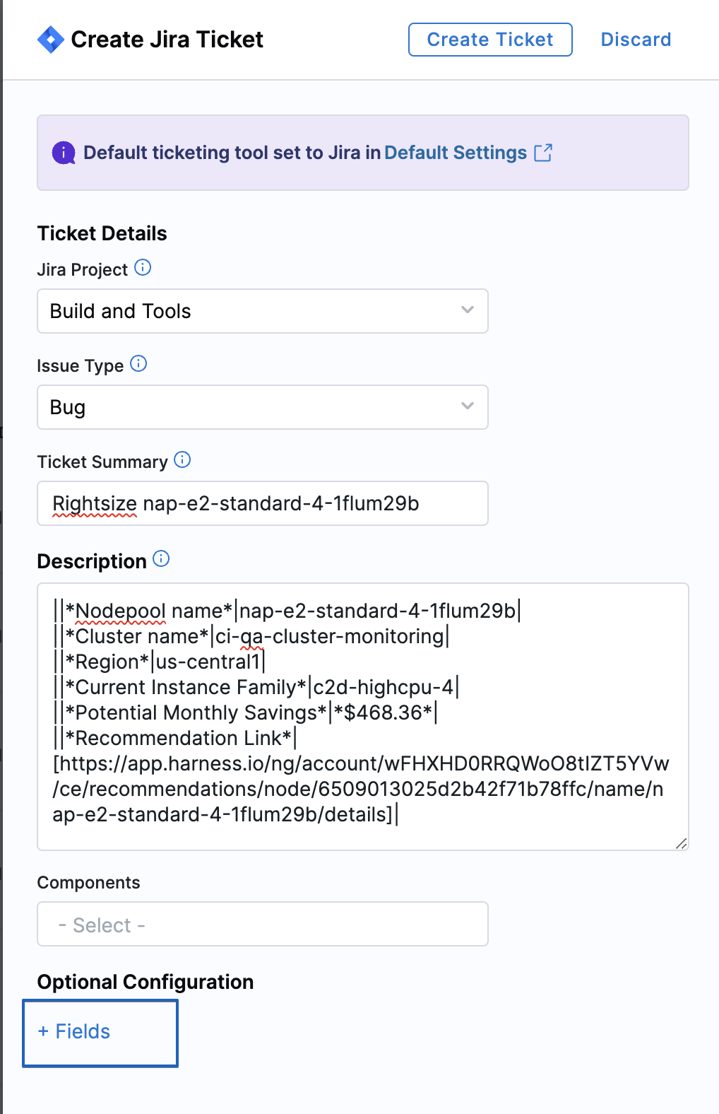 2. Default Project Mapping: Route recommendations to the right teams by mapping cost categories to specific Jira projects. When creating tickets, projects are auto-selected based on the resource's cost category, ensuring recommendations reach the appropriate stakeholders without manual routing.