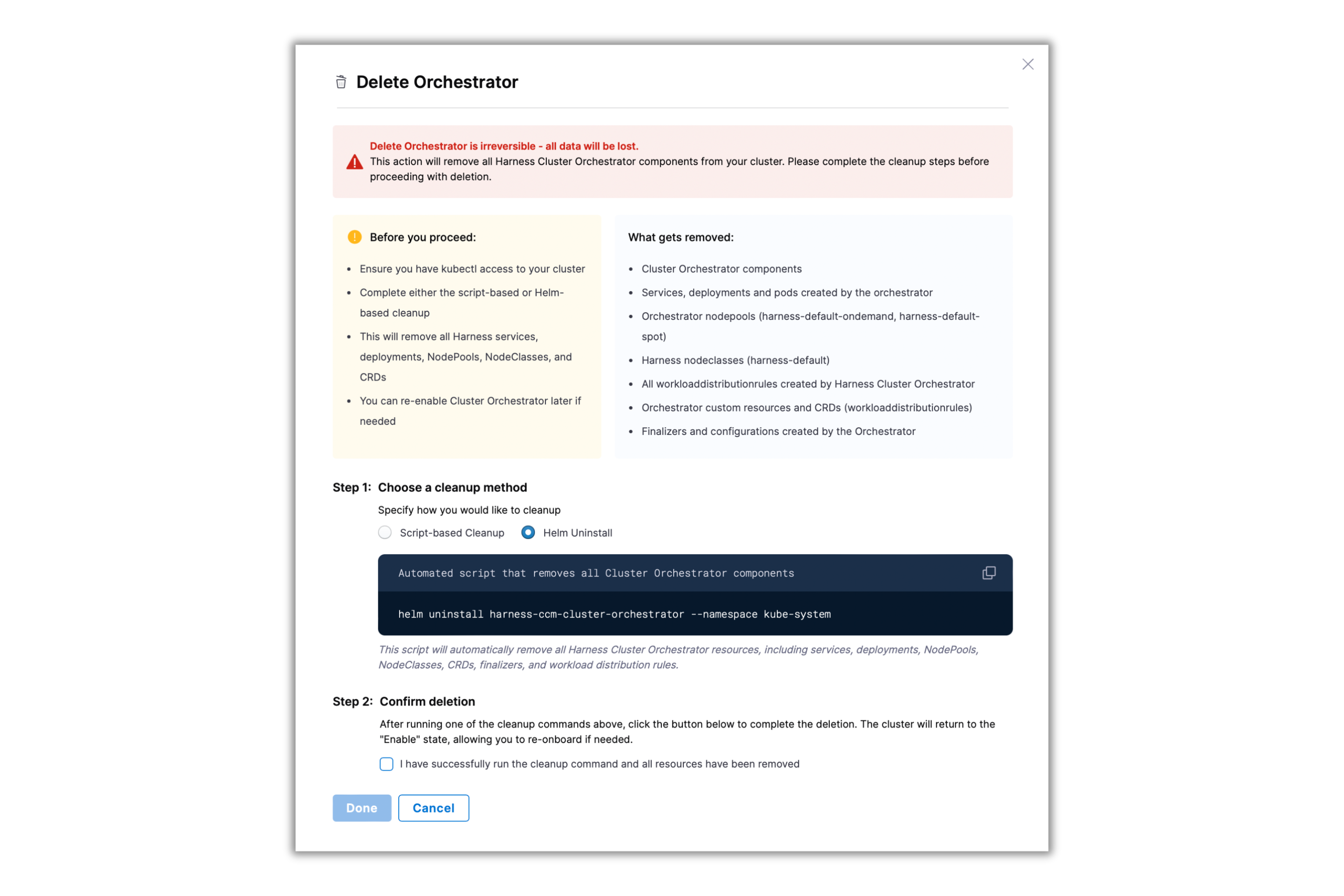• Cluster Orchestrator Deletion: We have added a deletion flow for Cluster Orchestrator, enabling users to fully remove all orchestrator resources and revert clusters via API, script, or Helm uninstall. This operation is only available for disabled clusters. [CCM-26694]