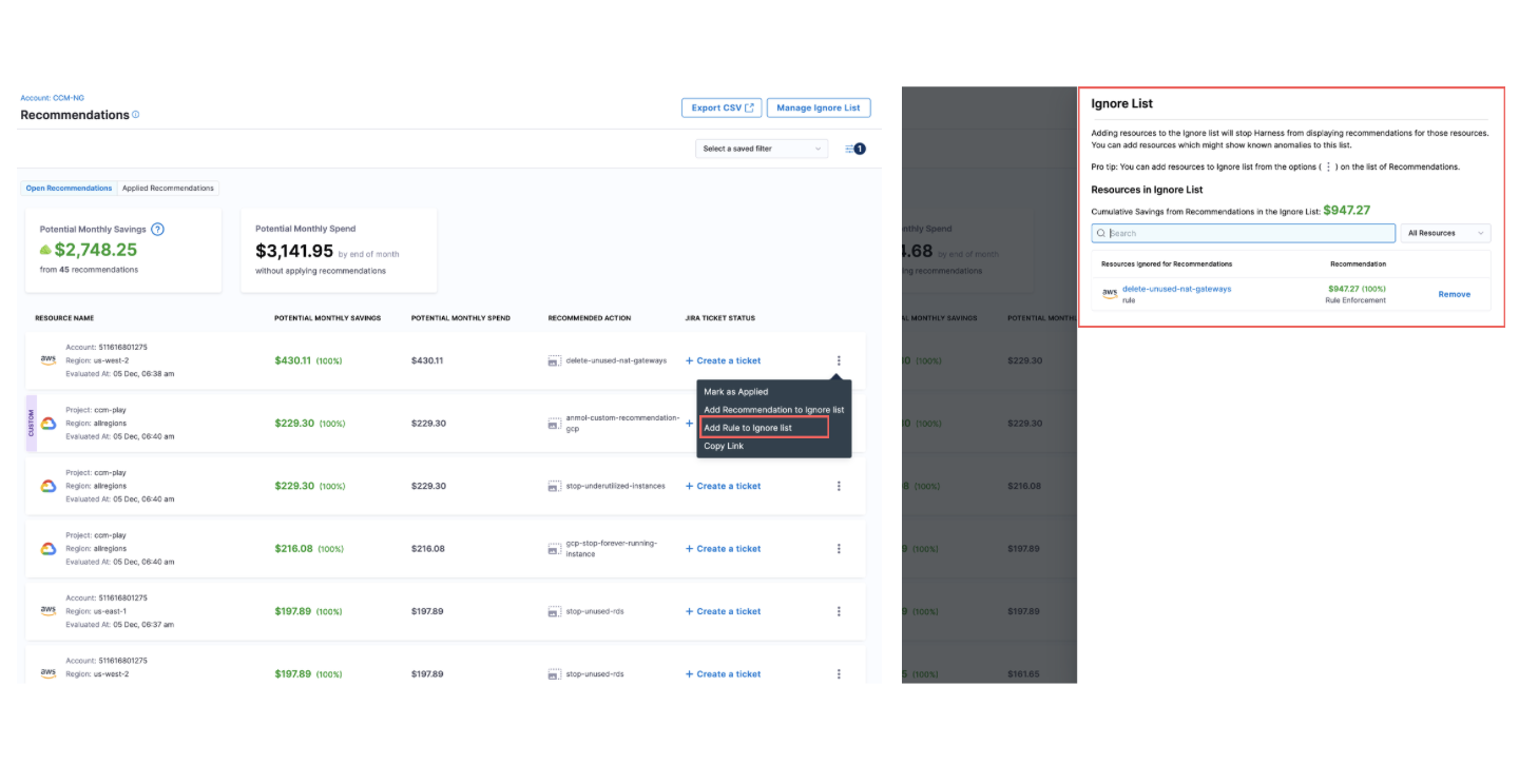 • Enhanced Recommendation Management: We’ve added support for temporarily ignoring recommendations. Users can now ignore a recommendation for 7, 15, or 30 days, or ignore it permanently. Once the selected duration expires, the recommendation will automatically move back to the Open tab on the Recommendations page. [CCM-27645]