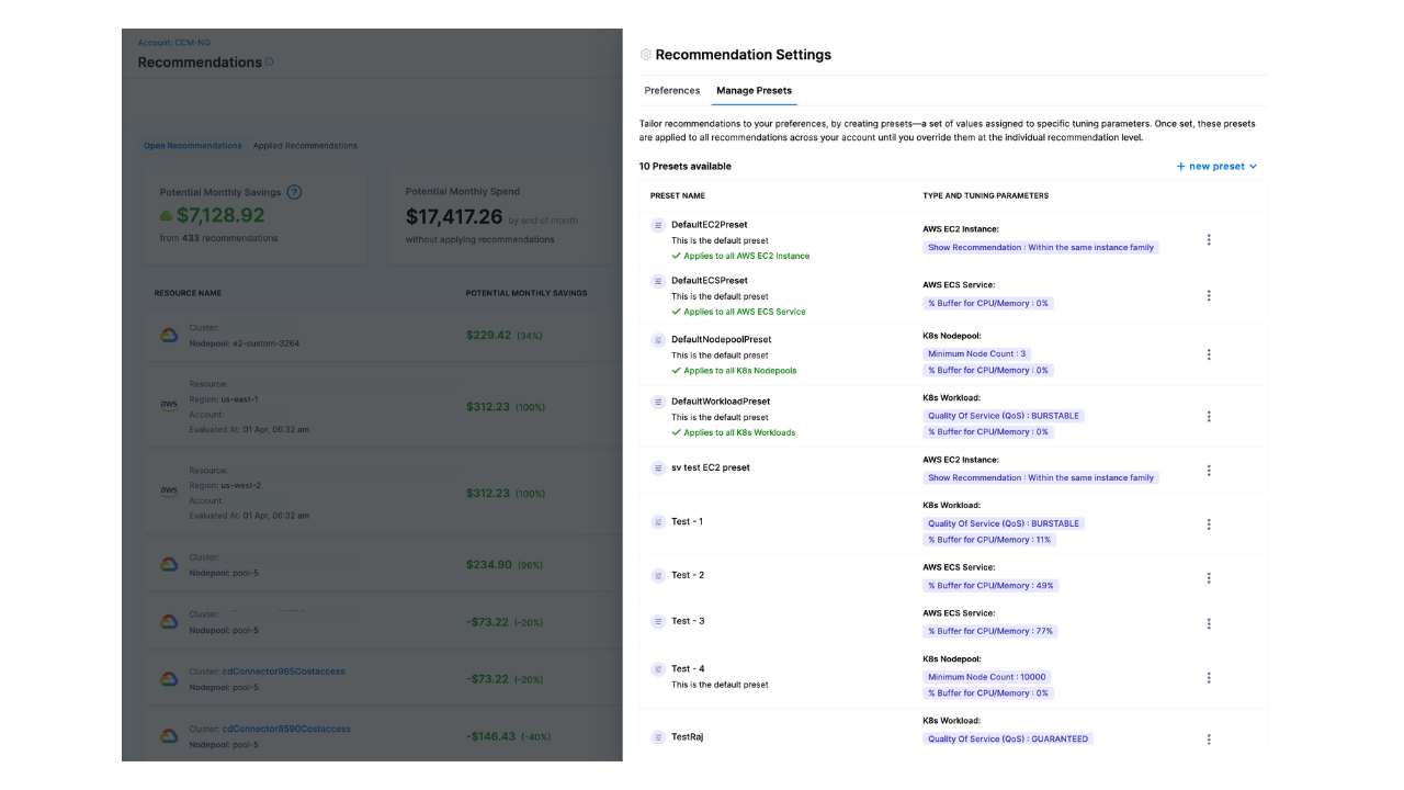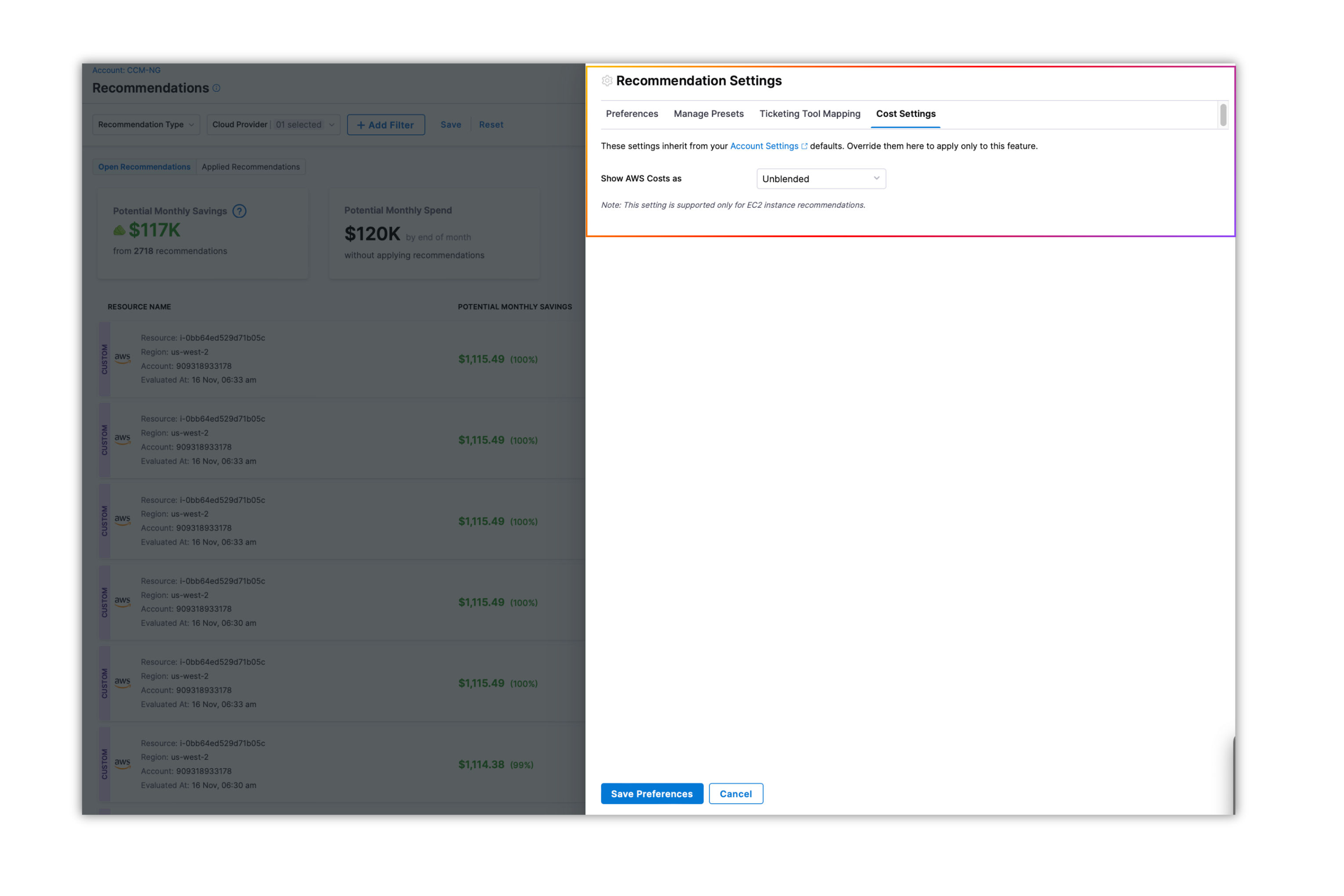 • Recommendations Cost Settings: We have added support for configuring AWS cost type settings (Net Amortized or Unblended) for EC2 recommendations. These settings inherit from your Account Settings defaults but can be overridden specifically for this feature. This feature is currently behind a Feature Flag. Please contact Harness support to enable it for your account. [CCM-27040]