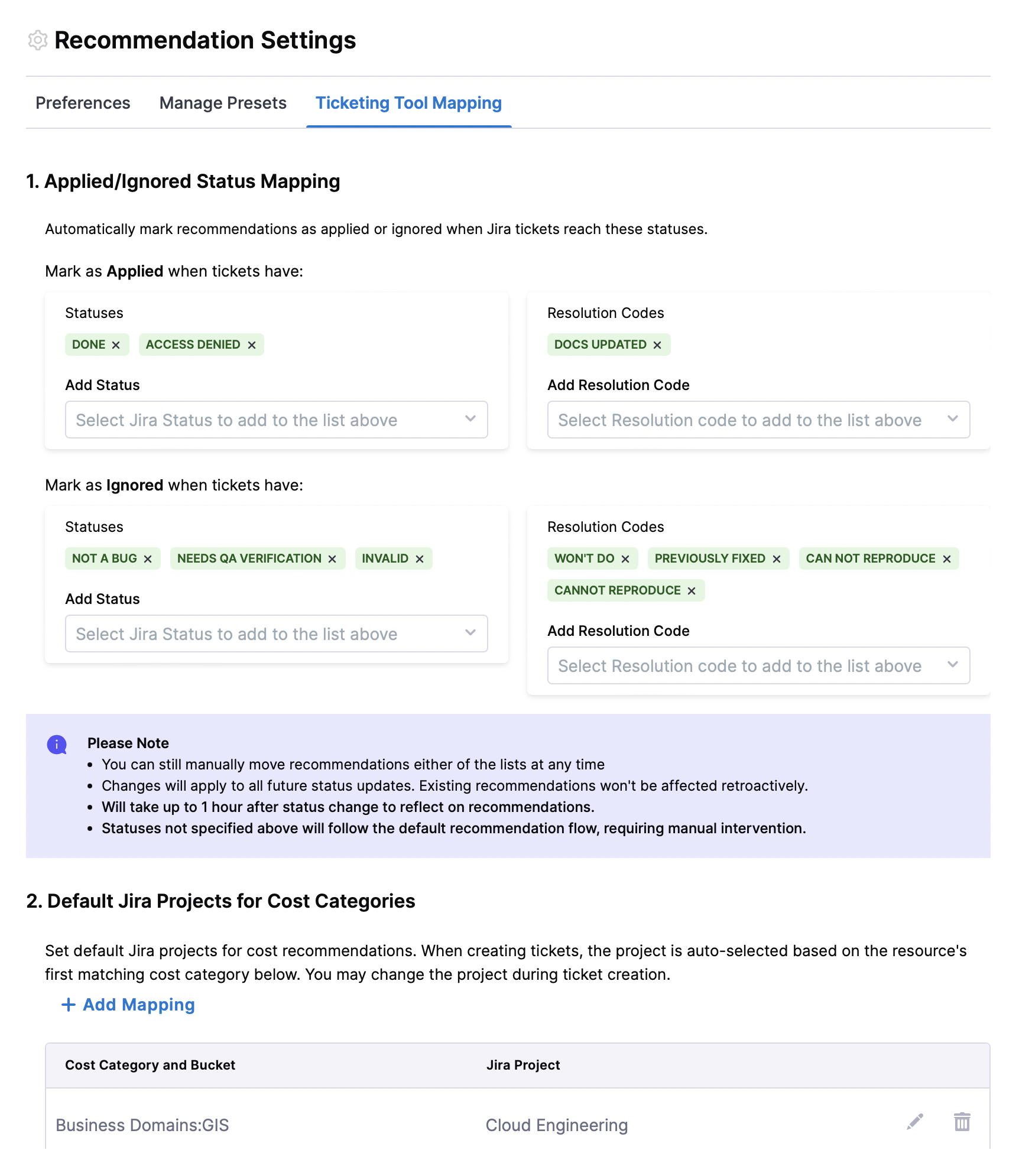 1. Status Mapping with Resolution Codes: Earlier, we introduced the ability to automatically update recommendation statuses based on Jira ticket status changes. Now, you can also choose Resolution Codes that will automatically update recommendations to Applied status.