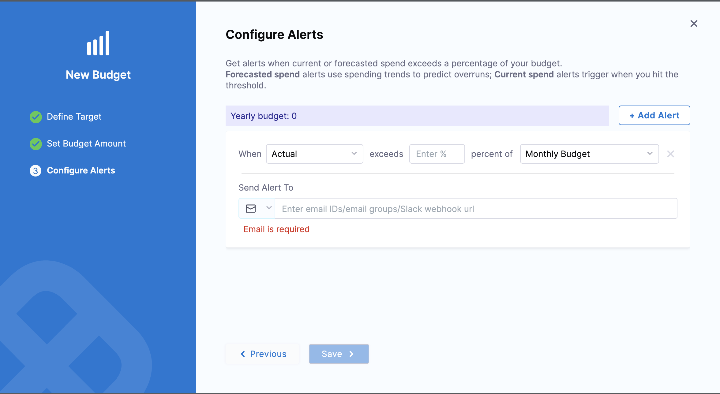 • Manage alerts across multiple budgets (add/remove recipients, delete alerts)